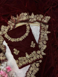 The saree is paired with a matching velvet blouse material, beautifully adorned with embroidery and sequin work on the front and sleeves, while the back is kept solid for a comfortable and flattering fit. Perfect for weddings, receptions, festive celebrations, and special occasions, this saree offers a luxurious drape and unmatched sophistication.